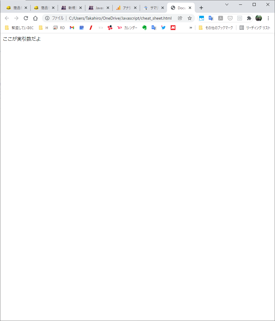 <script> function test(karihikisu) {//ここが仮引数 return karihikisu }; document.write(test("ここが実引数だよ")); </script>説明
