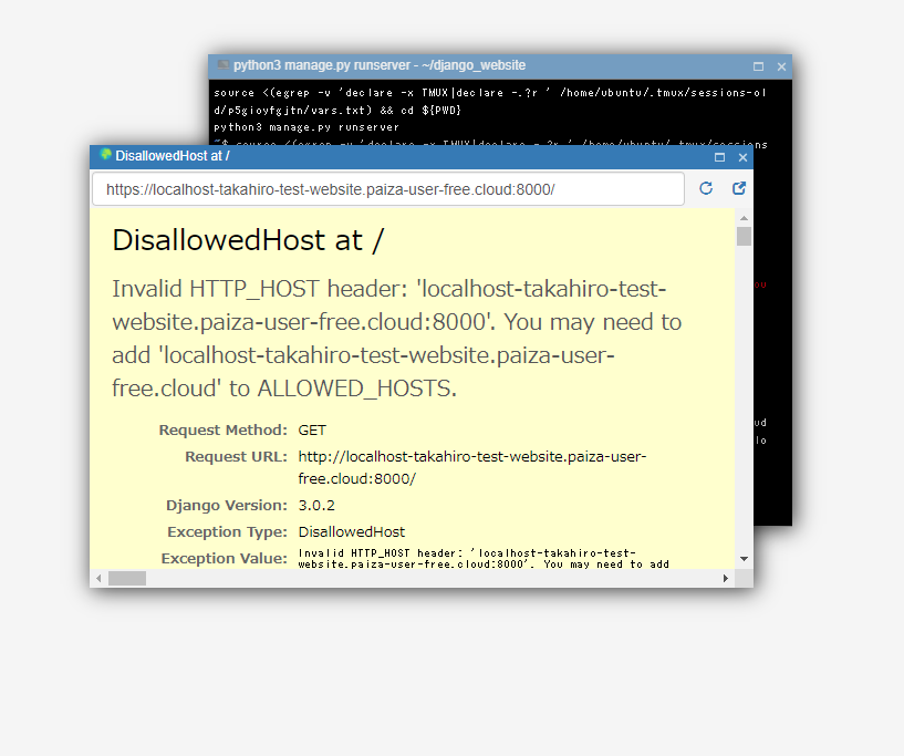 セキュリティは無視して、どんなURLでもアクセスできる設定になる。これで、「DisallowedHost at/」のエラーが消える。 - Ctrl+C