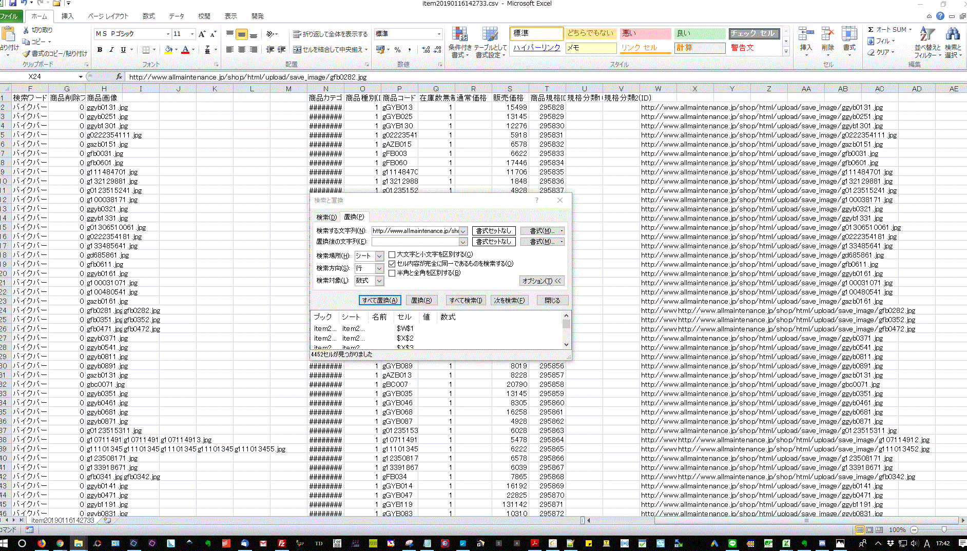 検索と置換>置換>セル内容が完全に同一であるものを検索する