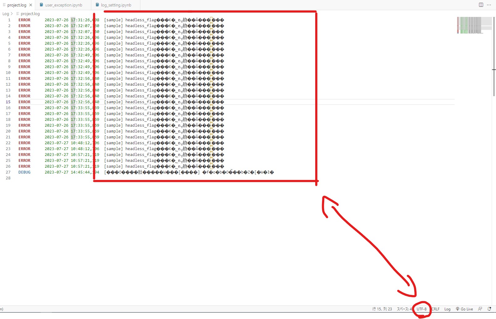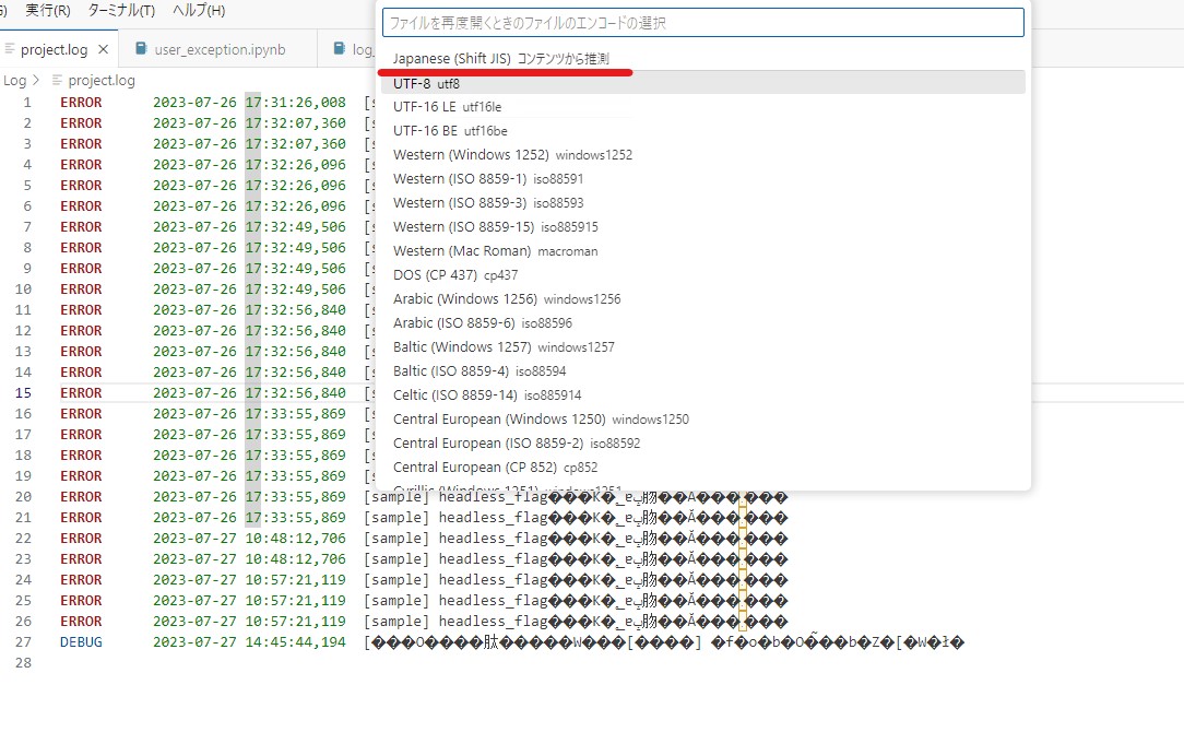 VSコードのログファイルが文字化けした状態が、以下の画像です。