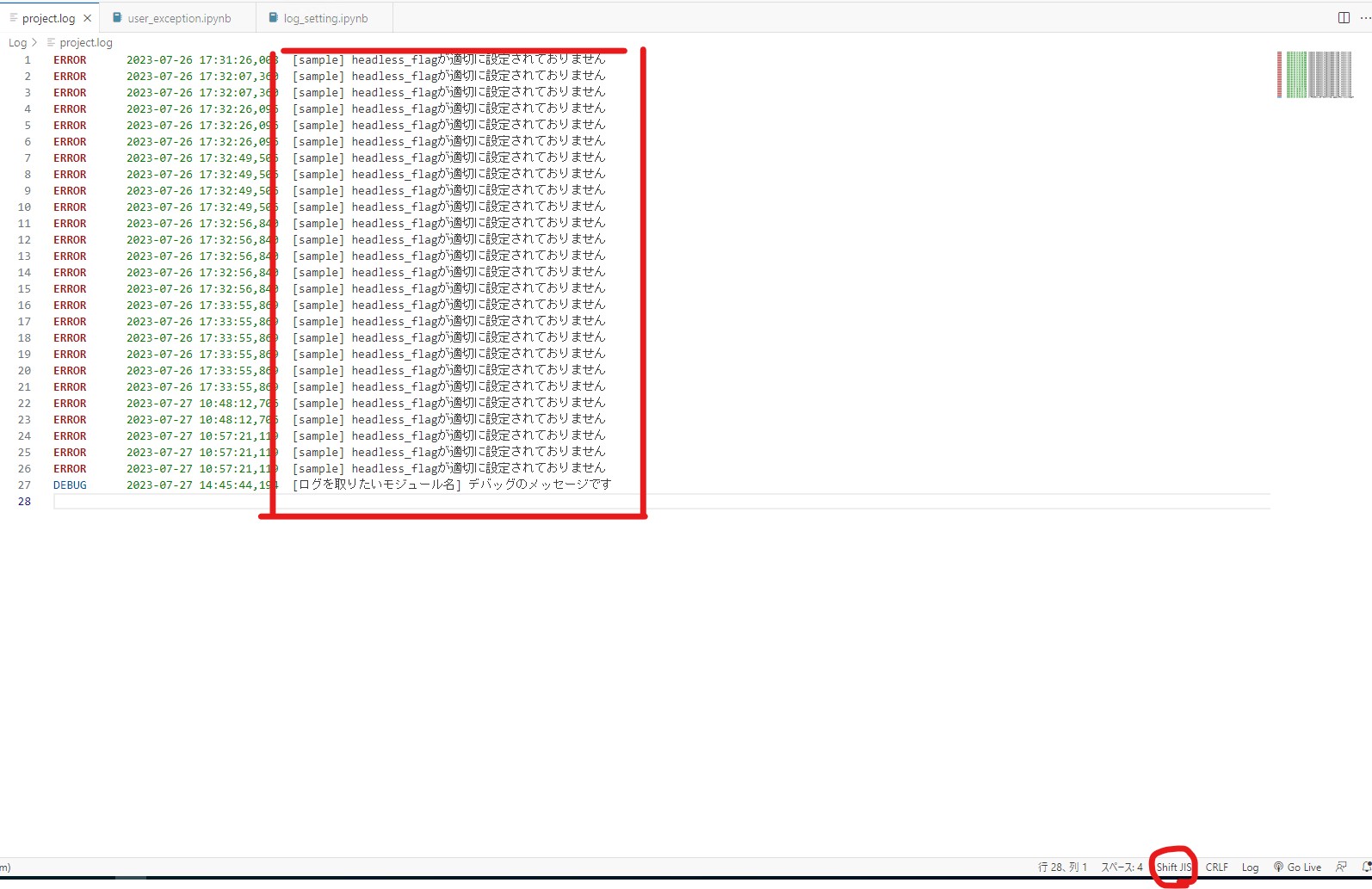 画面の右下の文字コードも「Shift-JIS」と表示されています。